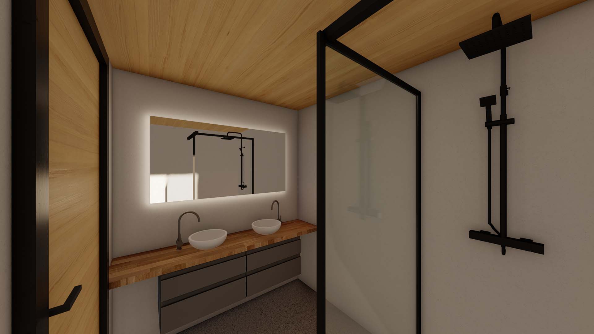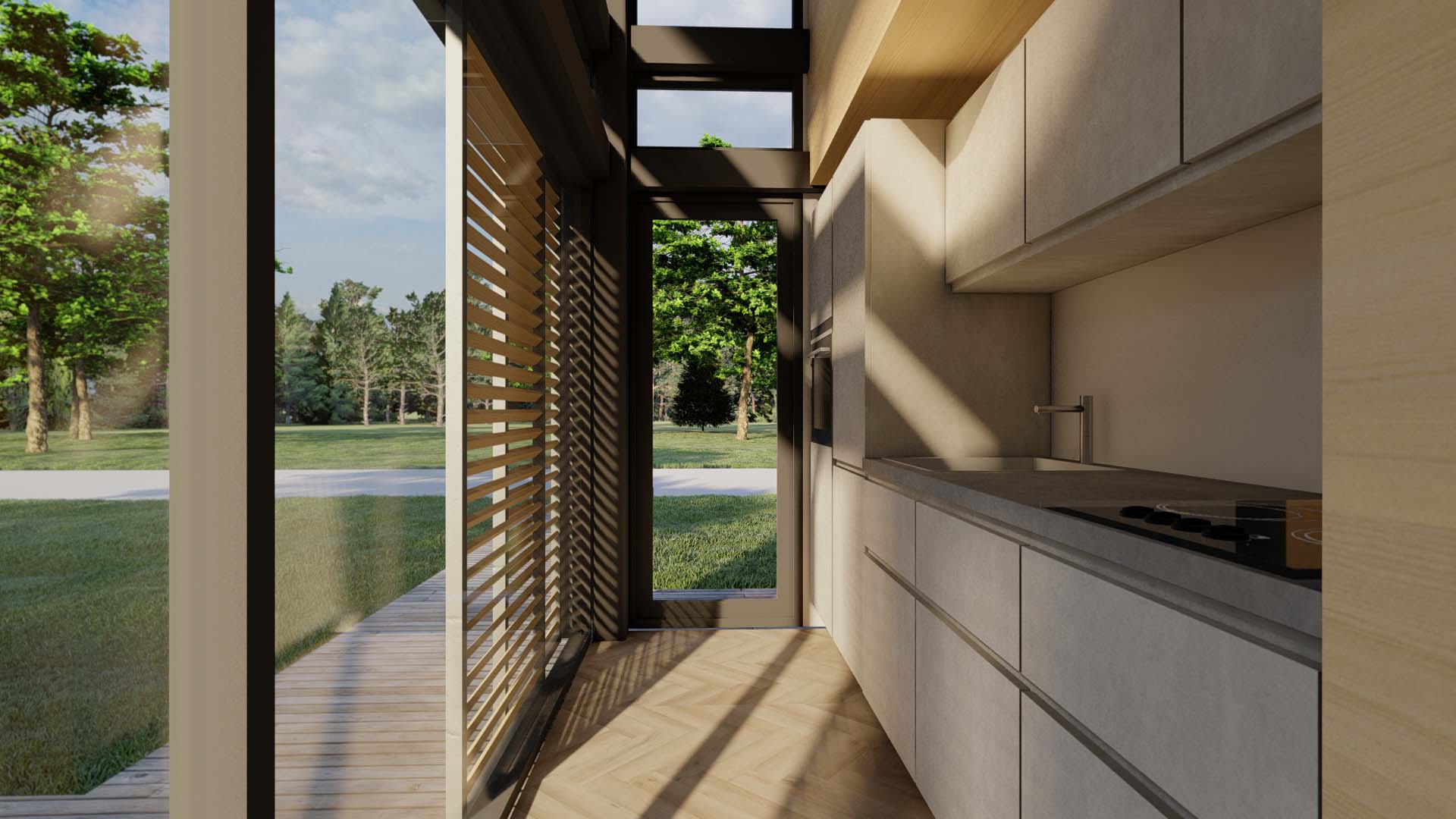 De keuken bevindt zich in een aparte ruimte en is standaard voorzien van twee hoge kasten, drie lage kasten met aanrechtblad, bovenkasten, een vaatwasser, een oven-combimagnetron, een vriezer en een koelkast. De badkamer beschikt over een inloopdouche en een wastafel, terwijl het toilet in een aparte ruimte is ondergebracht. Voor kinderen of gasten zijn er twee slaapplaatsen op de zolder beschikbaar.
